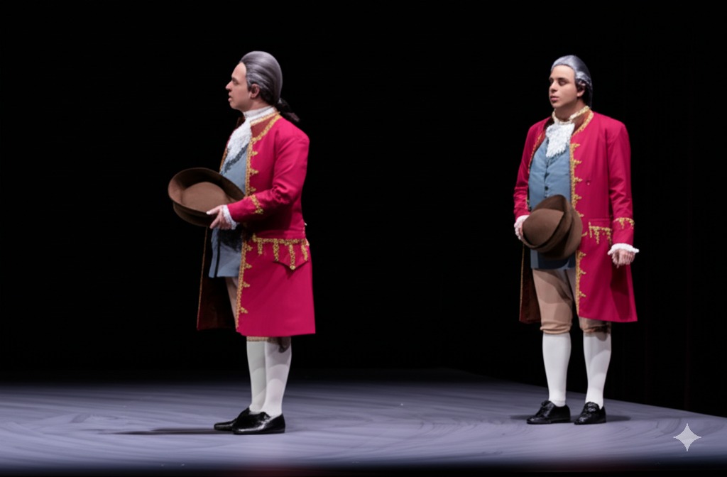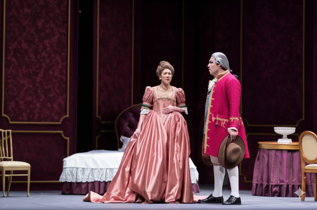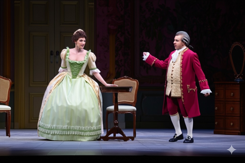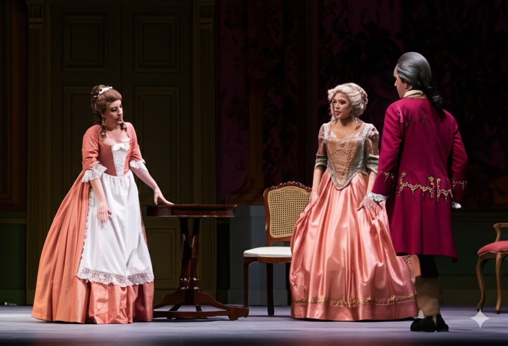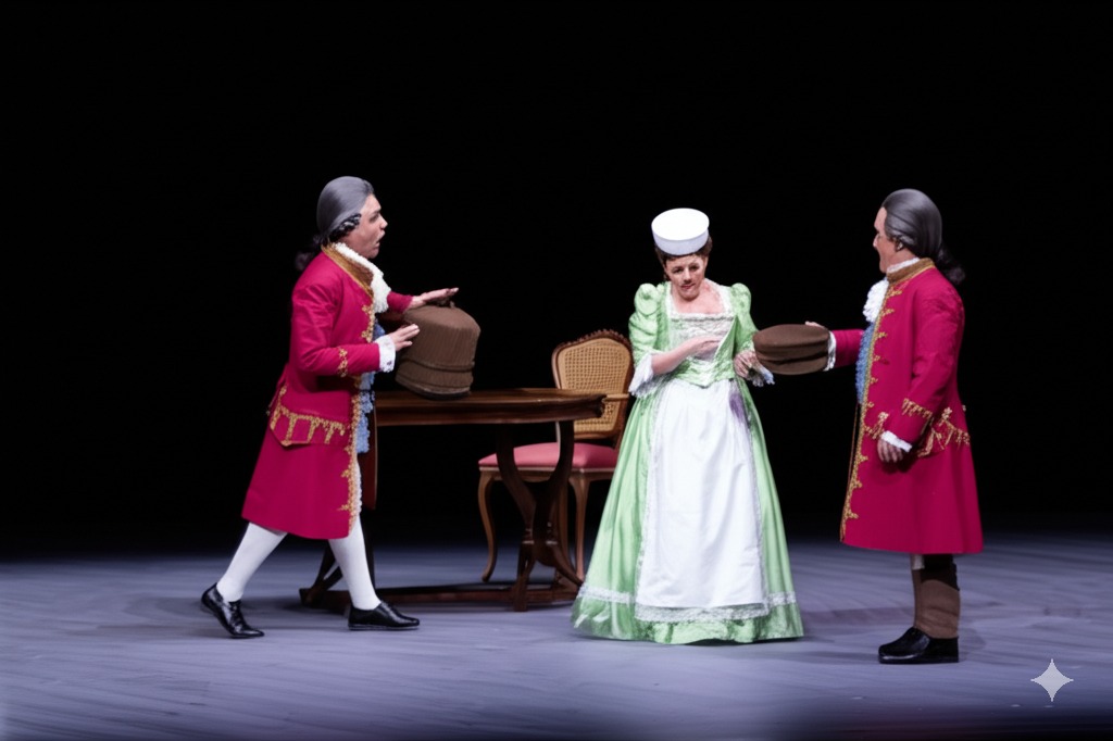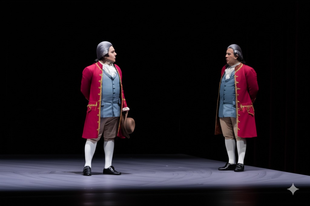 설명: 돈 알폰소는 페란도와 굴리엘모에게 자매들을 유혹하는 방법을 지시하며 특정 대상을 지정합니다. 굴리엘모는 도라벨라를, 페란도는 피오르딜리지를 쫓아야 합니다. 돈 알폰소는 서로 친구의 약혼녀를 유혹하게 한 것입니다.