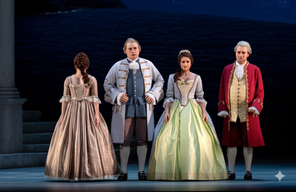 설명: 피오르딜리지와 도라벨라는 연인들의 초상화를 감상하며 감상적인 이중창으로 깊은 애정과 그리움을 표현합니다.