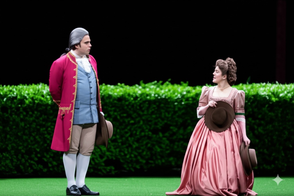 설명: 페란도는 피오르딜리지에게 그녀의 아름다움을 칭찬하고 그의 마음을 바치며 구애하려 합니다. 피오르딜리지는 처음에는 굴리엘모 (원래 약혼자)에 대한 변함없는 사랑을 선언하며 저항합니다.