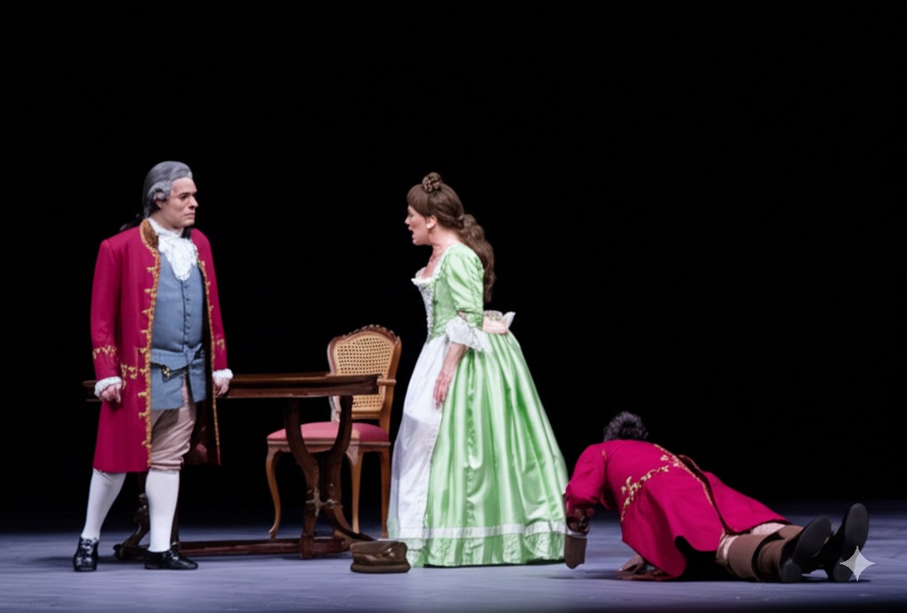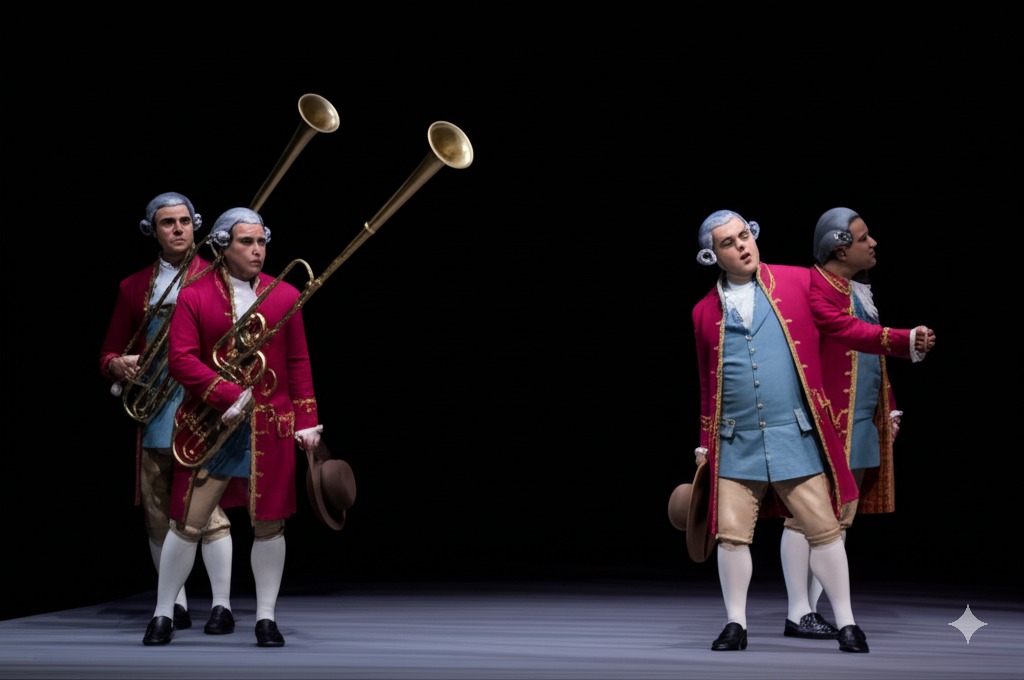 설명: 페란도와 굴리엘모는 거절당한 절망감에 독약을 마시는 척하며 극적인 장면을 연출합니다. 돈 알폰소와 (의사로 변장한) 데스피나는 걱정하는 척합니다.