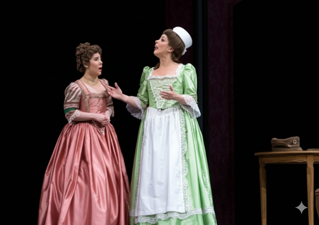 설명: 자매의 하녀 데스피나는 새로운 연인을 찾으라고 제안하며 그들을 위로하려 합니다. 자매들은 그녀의 실용주의에 충격을 받습니다.