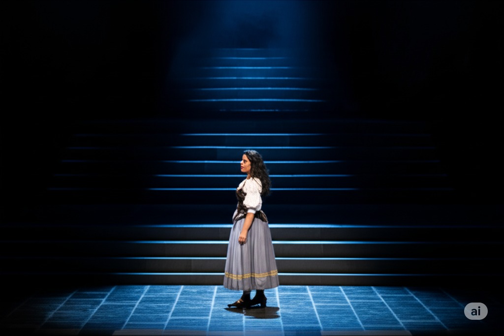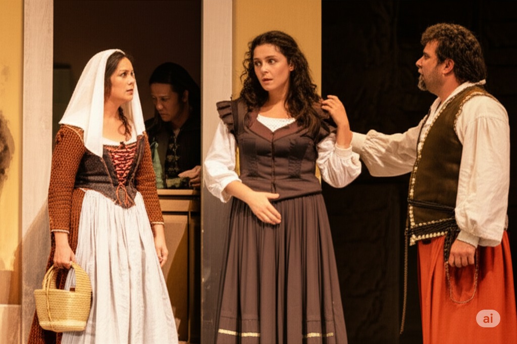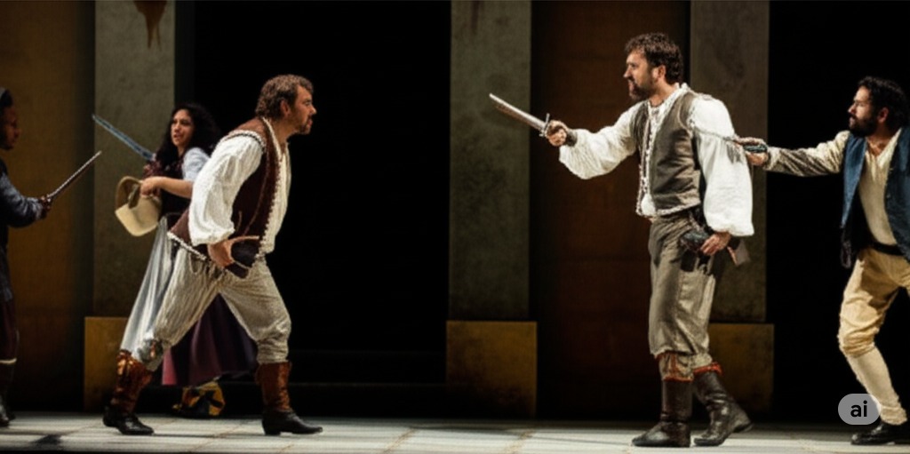 아름답고 가슴 아픈 관현악 간주곡이 연주되며, 감정적 격동과 다가오는 비극을 묘사합니다. 이미지는 음악의 더욱 추상적이고 감동적인 표현이 될 것입니다. 어쩌면 희미하게 불이 켜진 텅 빈 마을 광장에 다가오는 사건의 무게를 암시하는 그림자가 드리워져 있을 수도 있습니다. 또는 슬픔, 질투, 운명의 감정을 전달하기 위해 색깔과 형태를 사용한 더욱 상징적인 이미지가 될 수도 있습니다.