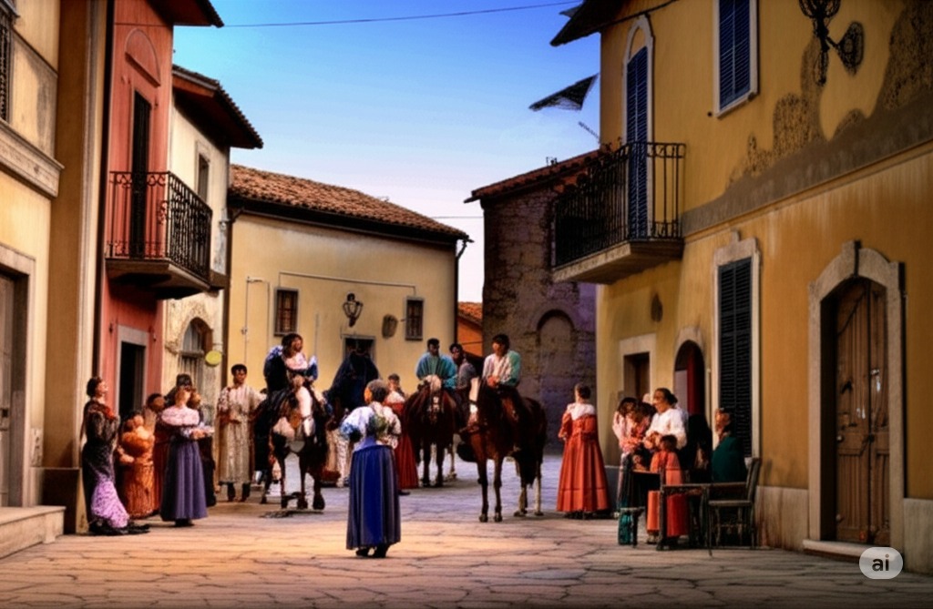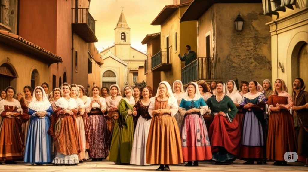 새벽이 밝아오고 마을 광장이 활기를 띱니다. 남녀노소 마을 사람들이 모여 아름다운 부활절 찬송가 "레지나 코엘리"(하늘의 여왕)를 부릅니다. 상투차가 불안한 표정으로 나타나 투리두의 어머니이자 광장에 있는 와인 가게 주인인 늙은 마마 루치아에게 다가갑니다. 상투차는 투리두를 보았는지 묻습니다. 마마 루치아는 그가 포도주를 가지러 갔다고 대답하며 상투차를 안으로 초대합니다. 이미지는 전통적인 시칠리아 의상을 입은 마을 사람들로 가득 찬 북적이는 마을 광장을 보여줄 것입니다. 떠오르는 해는 따뜻한 빛을 장면 위에 드리우며 축제 분위기를 강조합니다. 걱정스러운 표정의 상투차가 소박한 와인 가게 문간에 서 있는 마마 루치아에게 다가가는 모습이 보일 것입니다.