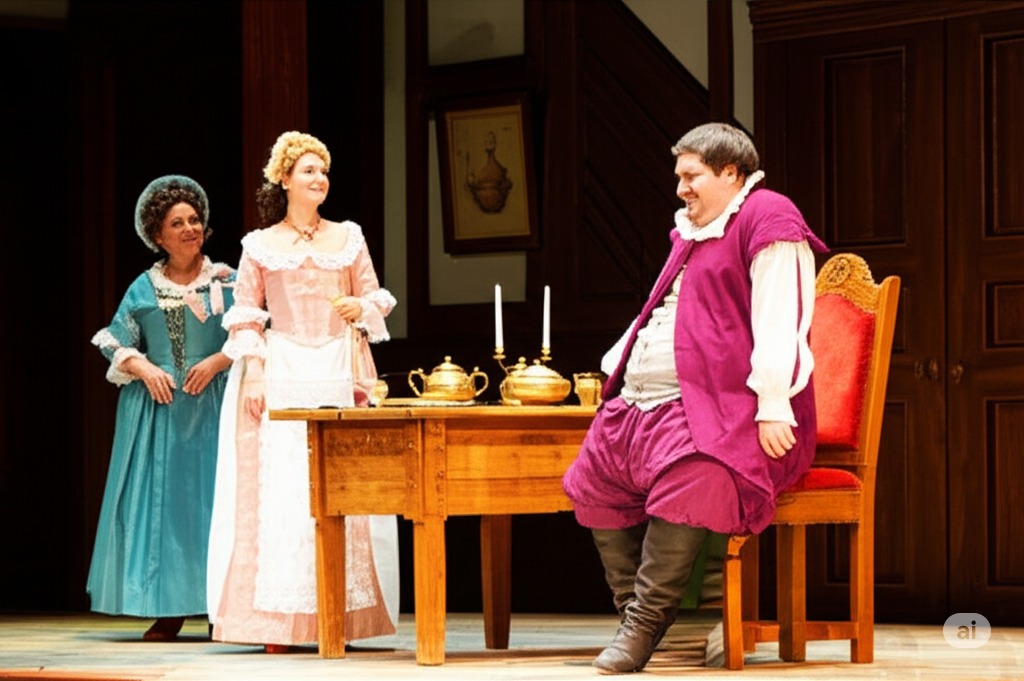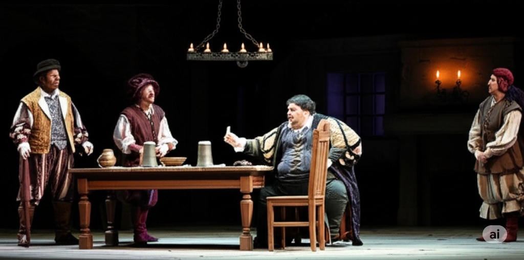 팔스타프 경이 가르터 여관에 앉아 술값을 터무니없이 많이 청구받고 분개하는 모습과, 앨리스 포드와 메그 페이지에게 동시에 구애하려는 계획을 세우는 장면을 묘사합니다. 그의 두 초라한 추종자인 바르돌포와 피스톨라가 옆에 서 있습니다. 배경은 다소 낡았지만 활기찬 여관 내부로, 나무 가구와 어두운 조명이 특징입니다.