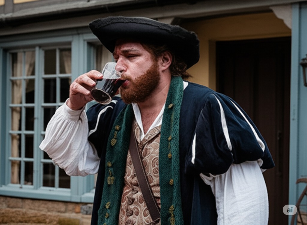 가르터 여관 앞에서 낙담하고 물에 흠뻑 젖은 팔스타프를 묘사합니다. 그는 뜨거운 와인을 마시며 자신의 불운을 한탄하고 있습니다. 배경은 약간 흐린 날씨의 여관 외부이며, 팔스타프의 상처 입은 자존심과 불편함을 포착합니다.