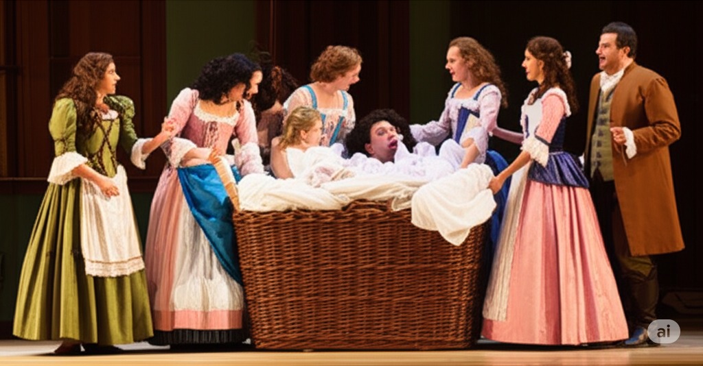 포드 씨 집 내부에서 포드 씨와 그의 친구들이 팔스타프가 아내와 함께 있는 현장을 잡을 것이라고 확신하며 갑자기 들이닥치는 극적인 순간을 묘사합니다. 앨리스와 그녀의 친구들은 팔스타프를 더러운 린넨 더미로 덮인 커다란 세탁 바구니 안에 숨기고 있습니다. 배경은 분주하고 긴장된 실내이며, 여성들이 팔스타프를 숨기기 위해 재빨리 생각하는 순간을 포착합니다.