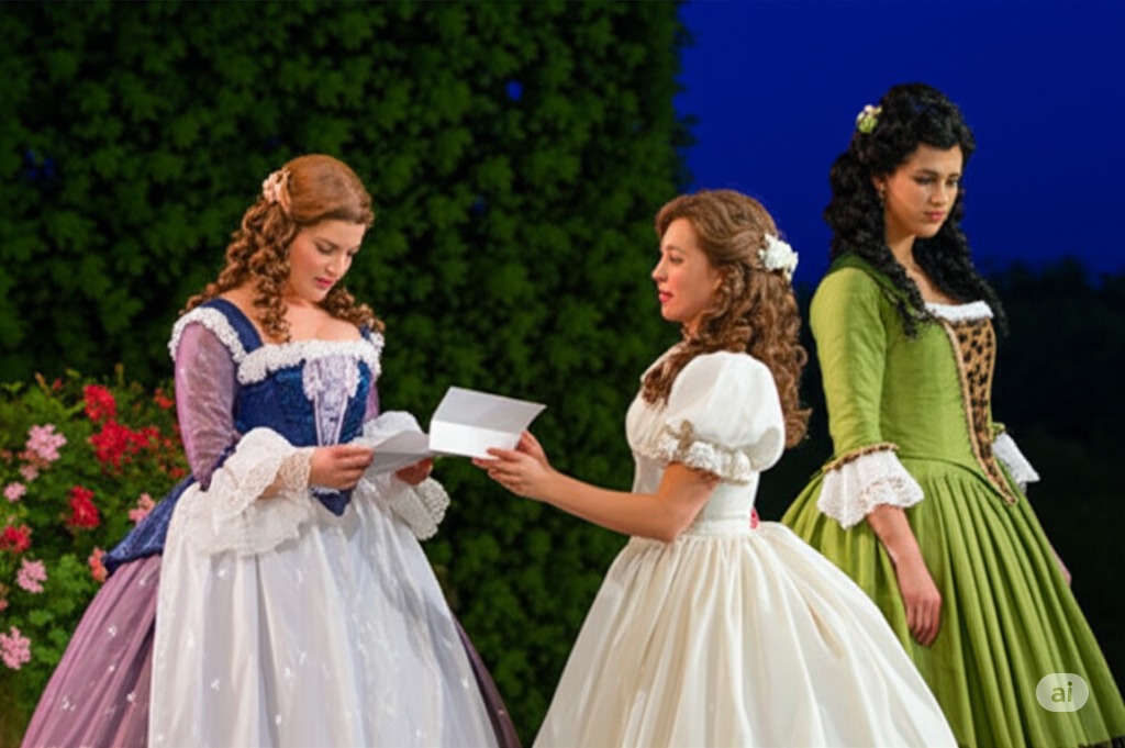 앨리스 포드의 정원에서 앨리스와 메그 페이지가 팔스타프에게서 온 똑같은 연애 편지를 읽고 있는 장면을 묘사합니다. 편지를 전달한 퀵클리 부인이 가까이 서 있습니다. 배경은 꽃과 녹색 식물로 가득한 즐거운 야외이며, 여성들이 팔스타프의 동시 구애를 재미있게 여기고 복수를 계획하는 순간을 포착합니다.