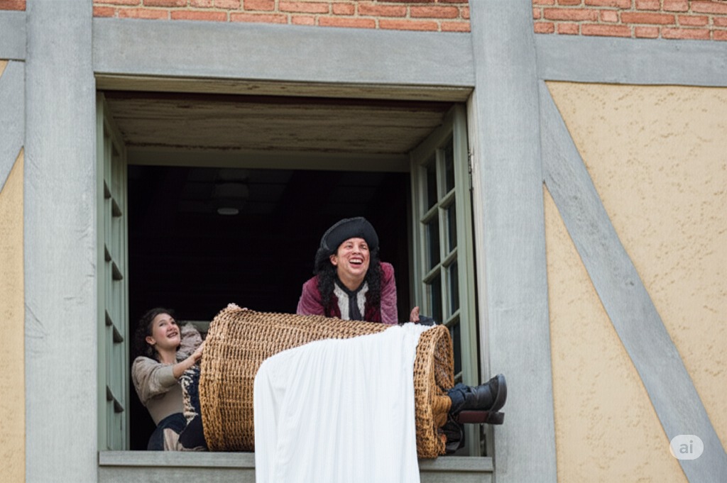 2막 2장의 굴욕적인 절정을 묘사합니다. 하인들이 팔스타프가 들어 있는 세탁 바구니를 창밖으로 던져 아래 템스 강으로 떨어뜨립니다. 앨리스, 메그, 그리고 포드 씨는 재미있고 만족스럽게 지켜봅니다. 배경은 포드 씨 집 외부로, 강이 보이며 여성들의 성공적인 장난의 절정을 포착합니다.