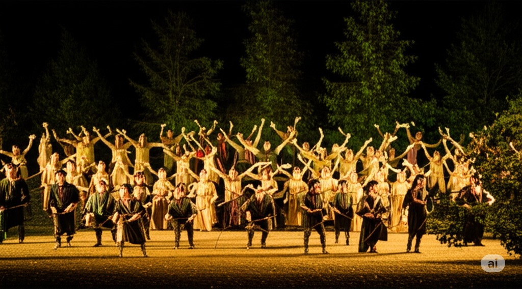 늦은 밤 윈저 대공원의 마지막 장면을 묘사합니다. 사슴 뿔로 변장한 팔스타프는 가면을 쓴 무리 (앨리스, 메그, 퀵클리 부인, 포드 씨, 펜턴 포함)에게 둘러싸여 유쾌하게 괴롭힘을 당하고 있습니다. 배경은 달빛 아래 나무 실루엣이 드리워진 어둡고 신비로운 공원으로, 유쾌한 장난의 절정과 전반적인 희극적인 분위기를 포착합니다.