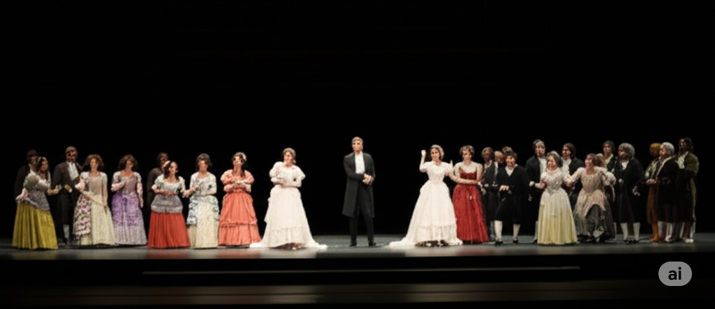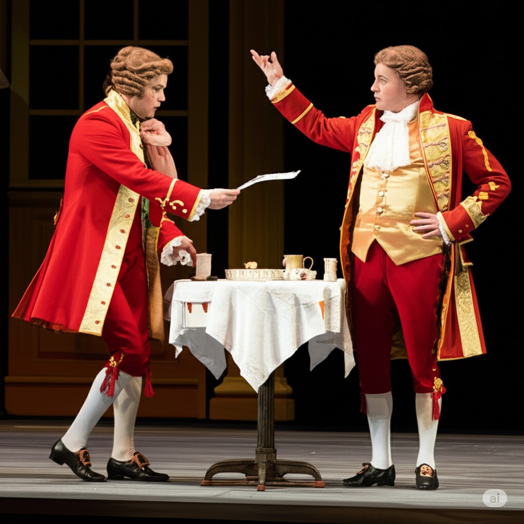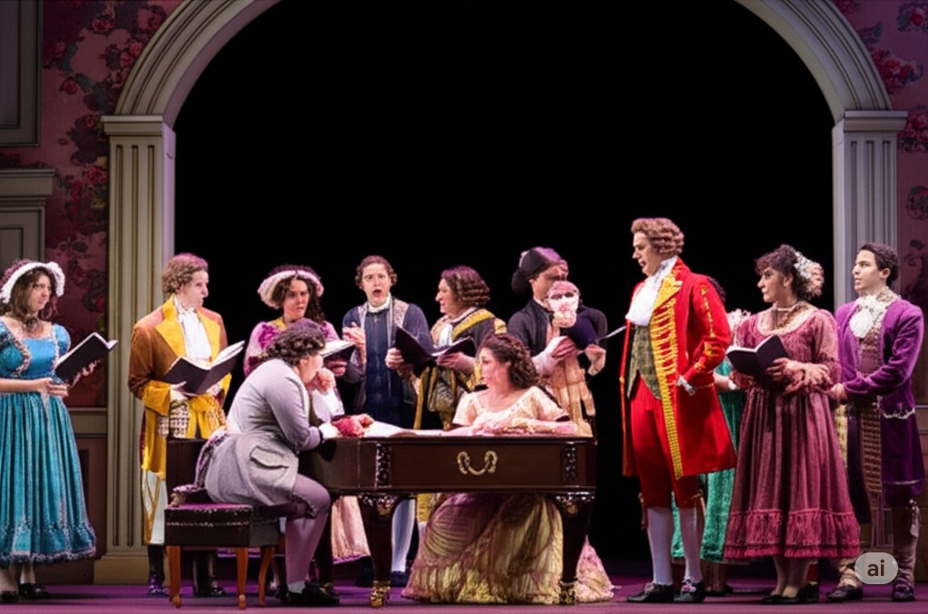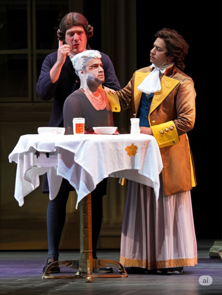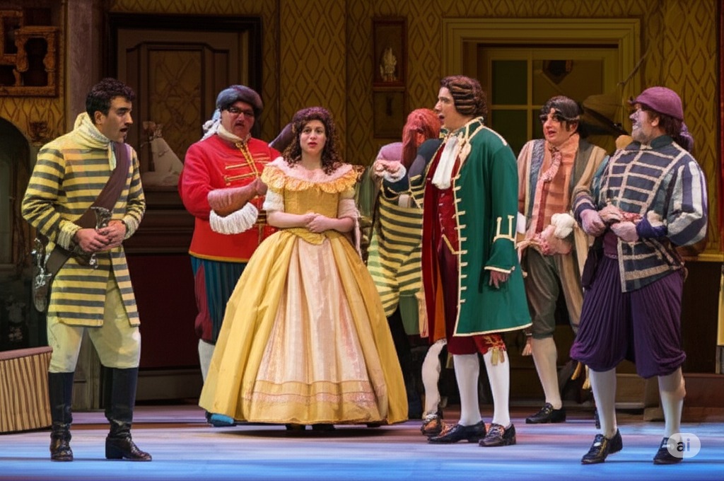 2막 4장: 바질리오가 예기치 않게 돌아오면서 잠시 계획이 틀어진다. 바질리오의 갑작스러운 등장에 모두 놀란 표정을 짓는다.