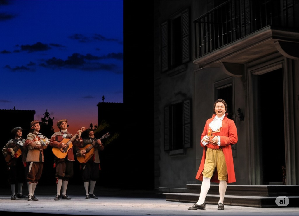 1막 1장: 새벽의 어두운 세비야 거리, 바르톨로 박사 집 발코니 아래 가난한 학생 린도로로 변장한 알마비바 백작이 악사들과 함께 로지나에게 세레나데를 부르고 있다. 고요하고 기대에 찬 분위기 속, 수평선 너머 희미하게 여명이 밝아오기 시작한다.
