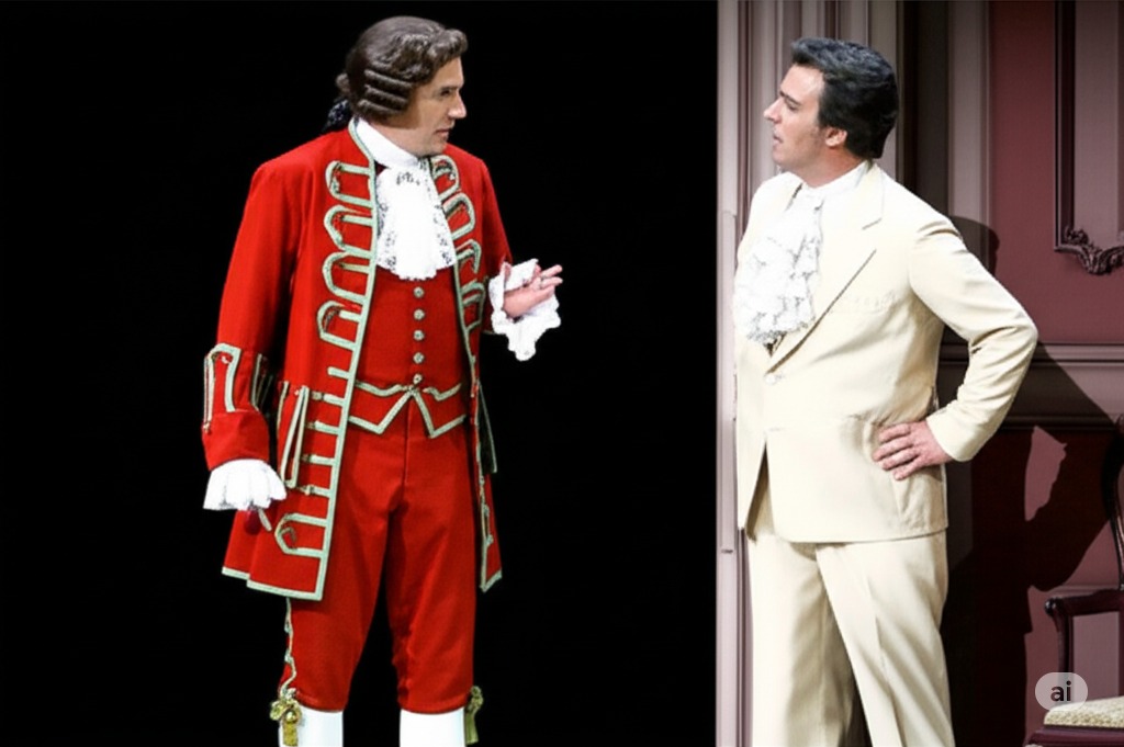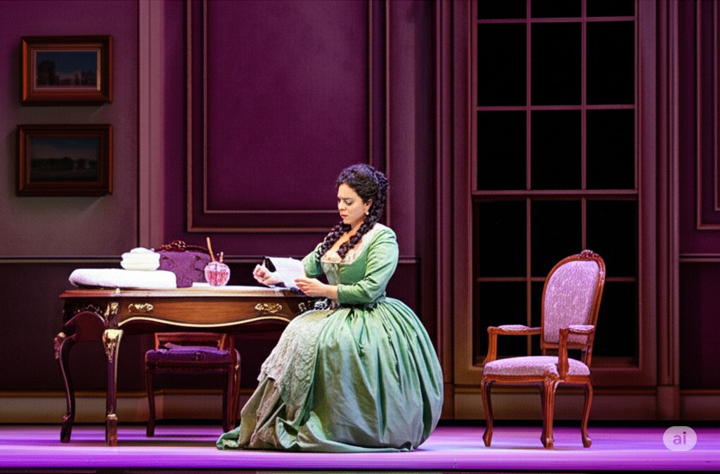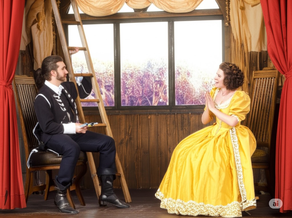 2막 6장: 알마비바 백작과 피가로가 로지나의 방에 사다리를 가지고 들어와 그녀와 함께 도망칠 계획을 세운다. 그들은 여행 복장을 하고 단호해 보이며, 로지나는 흥분과 불안감이 뒤섞인 표정이다.