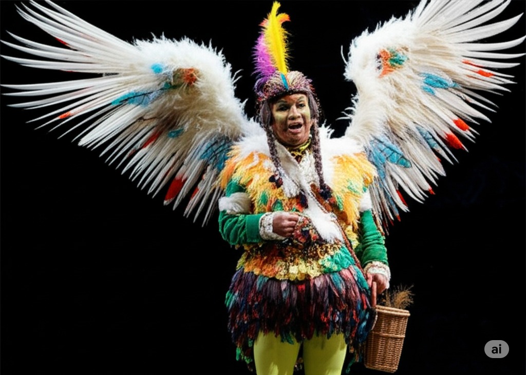 파파게노가 깃털로 장식한 옷을 입고 등장하여 타미노에게 자신의 새 잡는 솜씨를 자랑한다.