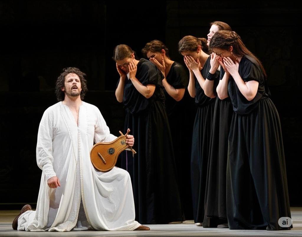 1막 1장: 황량하고 슬픈 장면. 오르페오는 어두운 옷을 입은 목동들과 님프들에 둘러싸여 에우리디체의 죽음을 애도하고 있습니다. 리라를 든 오르페오는 찢어지는 듯한 방식으로 그의 위로할 수 없는 슬픔을 표현하며, 아마도 눈물을 흘리고 절망에 잠긴 표정을 짓고 있을 것입니다.