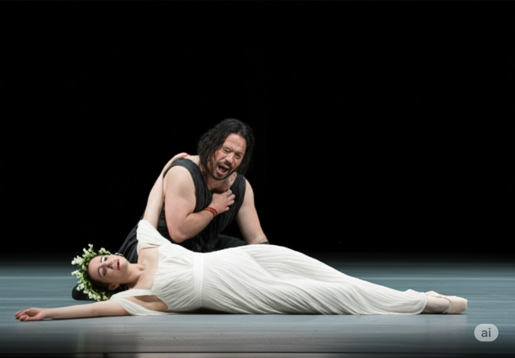 3막 2장: 비극적인 절정. 에우리디체의 간청과 의심에 괴로워하던 오르페오는 마침내 그녀를 돌아봅니다. 에우리디체는 즉시 그의 팔 안에서 힘없이 쓰러집니다. 오르페오는 자신의 치명적인 실수를 깨닫고 절망에 휩싸입니다.