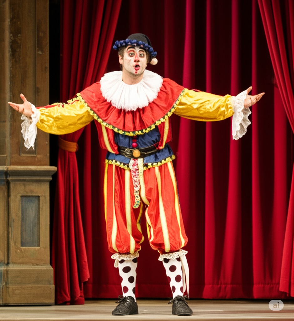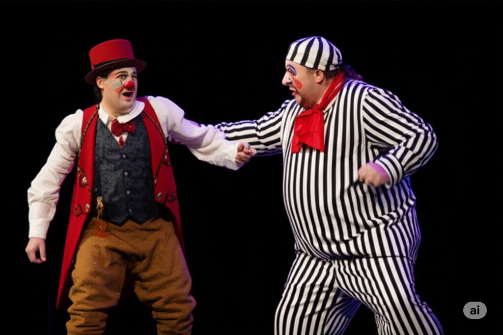 1막 5장: 토니오가 카니오에게 네다의 부정행위를 알린다. 분노와 슬픔에 휩싸인 카니오는 그녀의 연인의 이름을 묻지만 네다는 밝히기를 거부한다. 그는 칼로 그녀를 위협한다. 베페가 중재하고, 상심한 카니오는 저녁 공연을 준비한다 ("Vesti la giubba").
