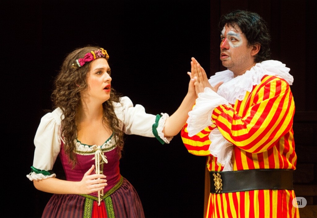 2막 5장: 베페가 극을 계속하라고 간청하지만 카니오의 분노는 고조된다. 콜롬비나 복장을 한 네다는 그를 진정시키려 하지만 실비오의 이름을 밝히기를 거부한다. 절박한 심정으로 그녀는 극 중 실비오에게 했던 작별 인사를 되풀이한다. 실비오가 그녀를 돕기 위해 관객석에서 달려온다.