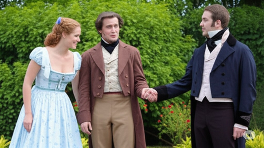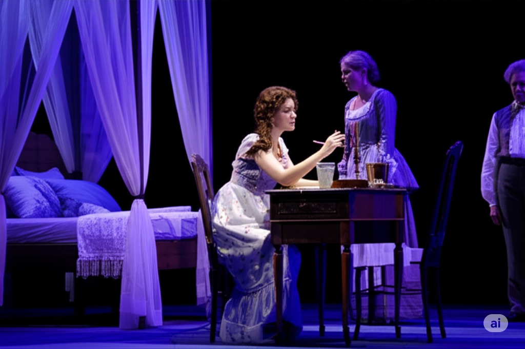 - 3장: 라린 영지 정원의 일부. 오네긴과 렌스키의 도착 장면을 묘사합니다. 오네긴은 세련되고 무관심한 태도를 보이며, 타티아나는 불안하게 정원에서 그에게 편지를 건넵니다. 올가와 라리나 부인은 배경에서 이 모습을 지켜보고 있습니다.