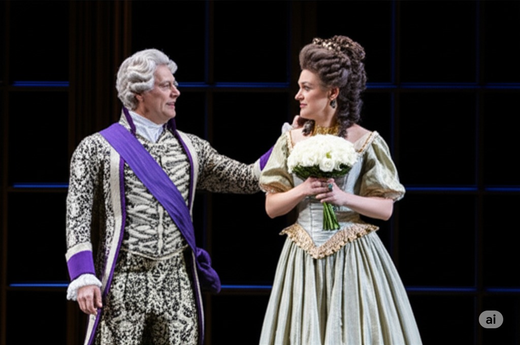 성대한 의식. 은색과 흰색의 우아한 복장을 입은 옥타비안이 은쟁반 위에 섬세한 은장미를 받쳐 들고 등장한다. 그는 소피에게 장미를 건네고, 그들의 시선은 마주치자마자 깊고 강렬한 연결을 형성한다. 의례적인 아름다움과 그들의 마음속에 움트는 서로에 대한 끌림이 대비되는 장면이다.