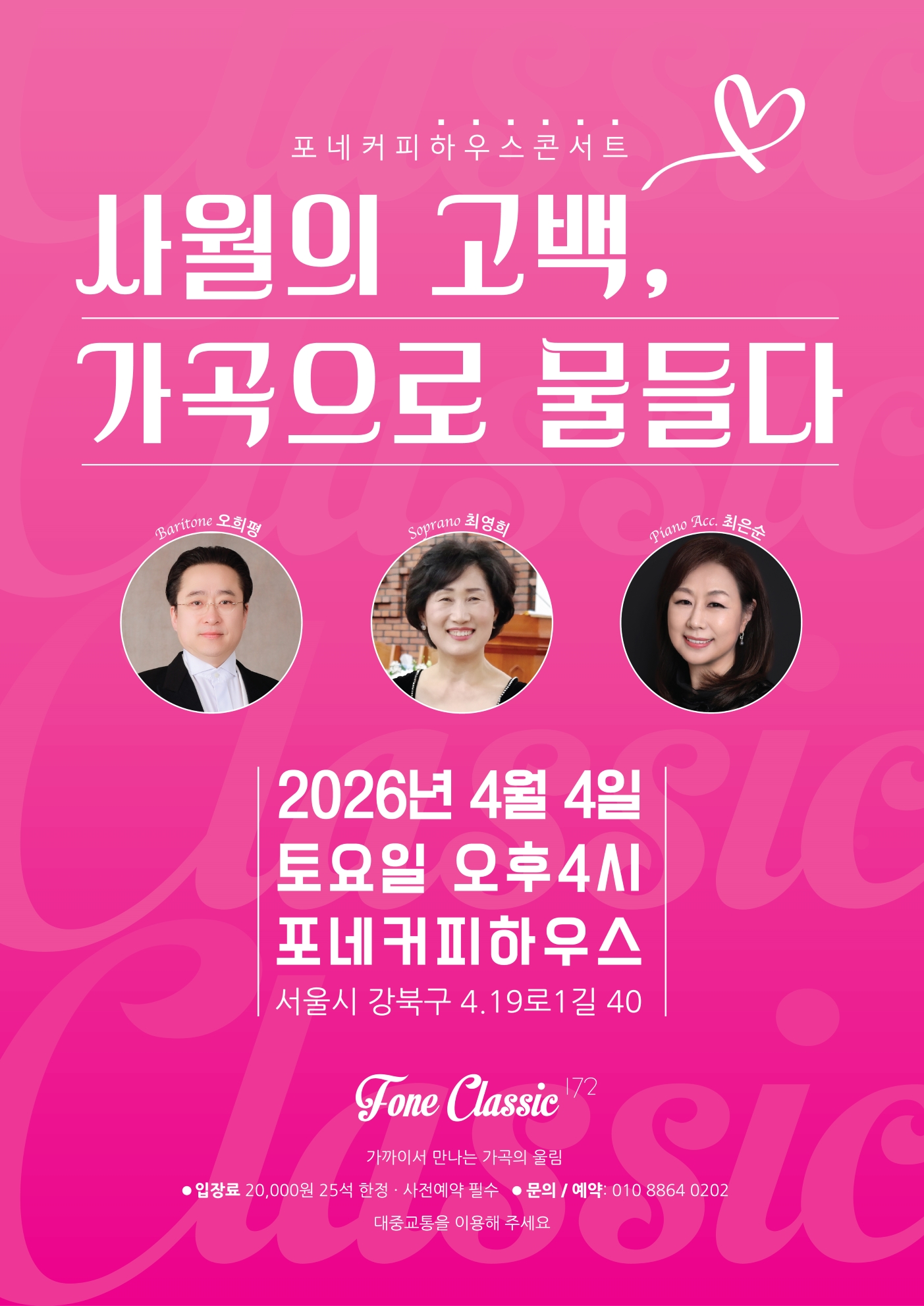 이번 공연은 더욱 가까운 거리에서 호흡하고 마음을 나누고자 아늑한 '포네커피하우스'에서 새로운 시작을 알리려 합니다.